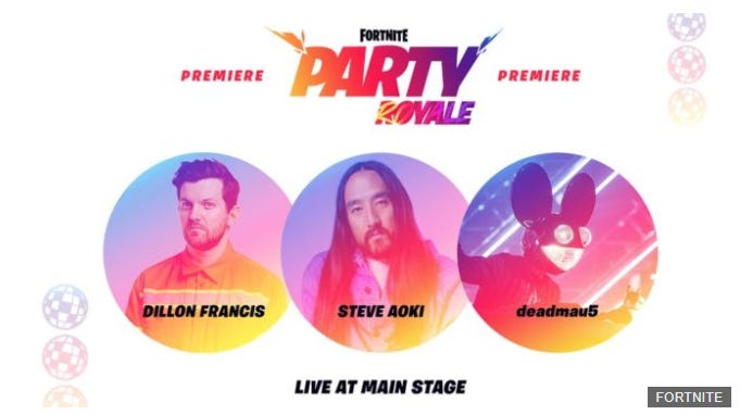 A live concert is taking place on the platform and features Dillon Francis, Steve Aoki and deadmau5.